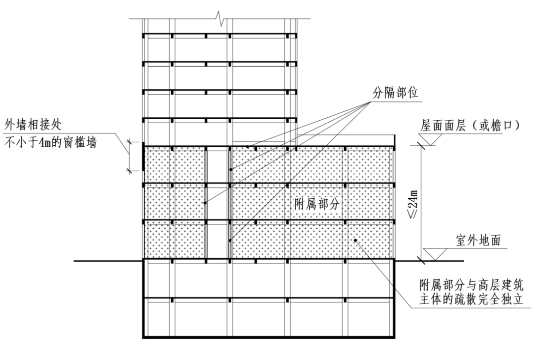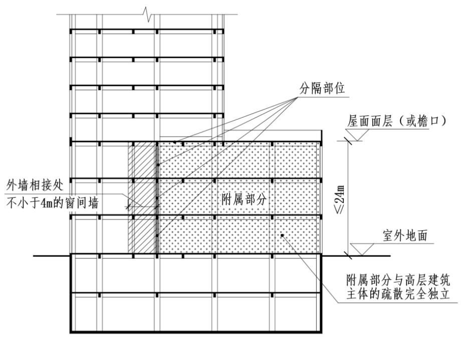 1.5.3 除住宅与其他使用功能建筑合建以外的多种功能组合的高层公共建筑下部的附属部分,当同时符合下列1~3款规定时,主体建筑与附属部分的安全疏散和消防电梯设置可根据各自的高度分别按规范执行;当附属部分同时符合下列1~4款规定时,主体建筑与附属部分的安全疏散、消防电梯和防火分区的设置可根据各自的高度分别按规范执行:(附图1.5.3) 1 与主体建筑相连且建筑高度不大于24m;