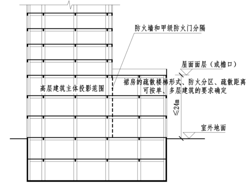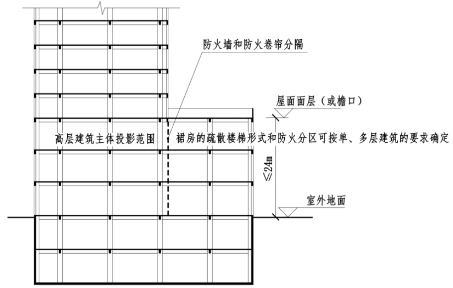 1.5.2 当裙房与主体之间在高层建筑主体投影范围外(含投影线)采取防火墙分隔时,该裙房的疏散楼梯形式和防火分区可按单、多层建筑的要求确定;当该防火墙开口部位采用甲级防火门,不采用防火卷帘替代时,该裙房的疏散距离也可按单、多层建筑的要求确定。(附图1.5.2)