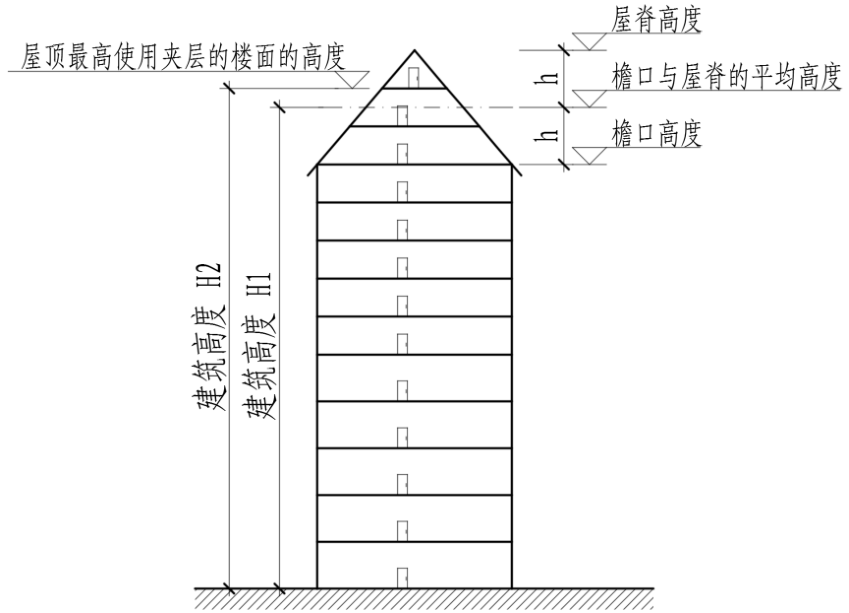 1.1.2 建筑屋面为坡屋面时,建筑高度应按建筑室外设计地面至檐口(按照建筑外墙面起坡处起算)与屋脊的平均高度(H1)或建筑室外设计地面至屋顶最高使用夹层的楼面的高度(H2)取较大值。(附图1.1.2)