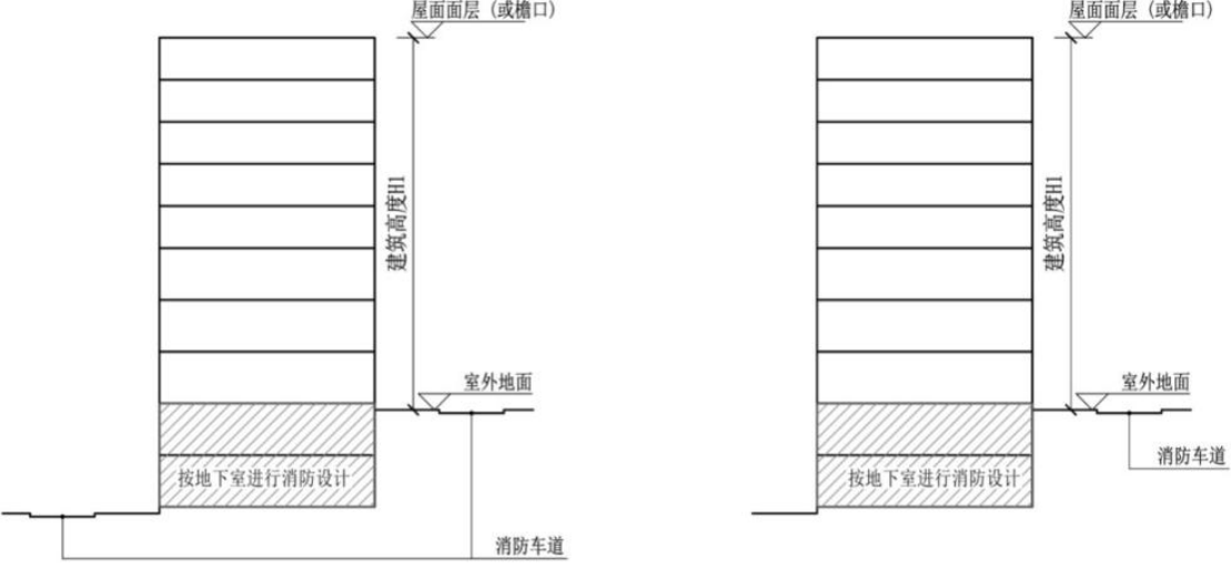 1.2.1 按规范需要设置环形消防车道的建筑,当其较低室外地坪和较高地坪形成环形消防车道或沿建筑的两个长边设置贯通式或尽头式消防车道时,可按较高或较低室外地坪(与应设置的消防登高操作场地的标高应一致)起算建筑高度;按规范要求受条件限制不能沿两个长边设置消防车道,实际只沿建筑的一个长边设置消防车道的建筑,其最大进深不宜大于50m,可按消防车道的相应室外地坪(与应设置的消防登高操作场地的标高应一致)起算建筑高度;其余按照《建筑设计防火规范》未要求设置消防车道的建筑,可按照实际室外地坪情况确定起算建筑高度。(附图1.2.1)