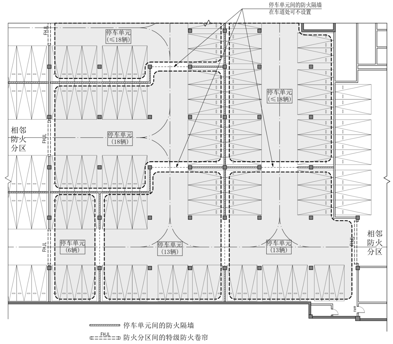 9.7.7 在汽车库(不包括中型车、大型车汽车库)内设置或预留电动汽车充电设施时,宜在每个防火分区内集中布置,且设置或预留电动汽车充电设施的区域应划分停车单元。停车单元应符合下列规定:(附图9.7.7) 1 每个停车单元的停车数量不宜大于12辆,不应大于18辆(以标准小型车为当量计算);行车道本身不可作为停车单元划分边界;