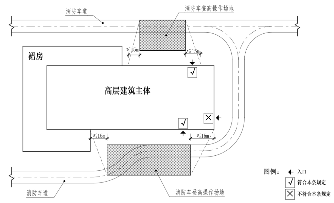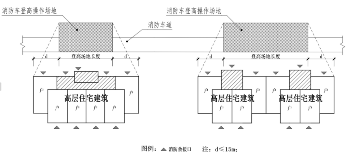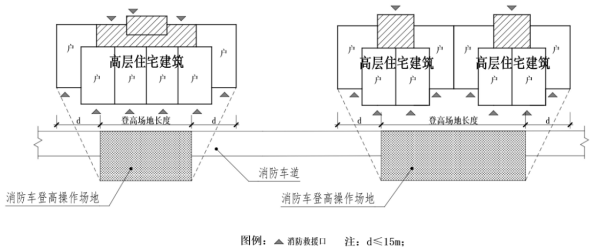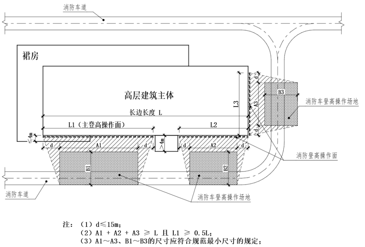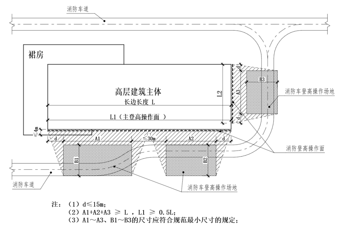 1 消防车登高操作场地的总长度不应小于高层主体的长边长度;消防车登高操作场地对应建筑立面两侧各延伸不大于15m范围为消防登高操作面;消防车登高操作场地应与消防登高操作面对应,登高操作场地之间应通过消防车道连通;