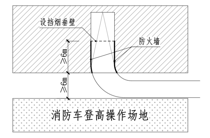 2.1.9 《建筑设计防火规范》第7.2.2条第1款规定的“车库出入口”不包括非机动车出入口。消防车登高操作场地与登高操作面的建筑外墙之间不应设置汽车库(坡道)出入口。当设有在建筑投影范围内的汽车库(坡道)出入口时,建筑外墙与消防车登高操作场地的距离不应小于6m,用于汽车疏散且不应影响消防车的通行;汽车库(坡道)出入口两侧应设置长度不小于6m的不开设门窗洞口的防火墙,汽车库坡道应设置自动喷水灭火系统,汽车库应设置排烟设施,且坡道出入口应设置高度不小于1.0m的挡烟垂壁。