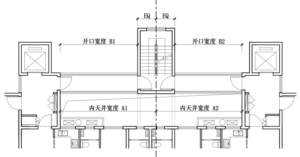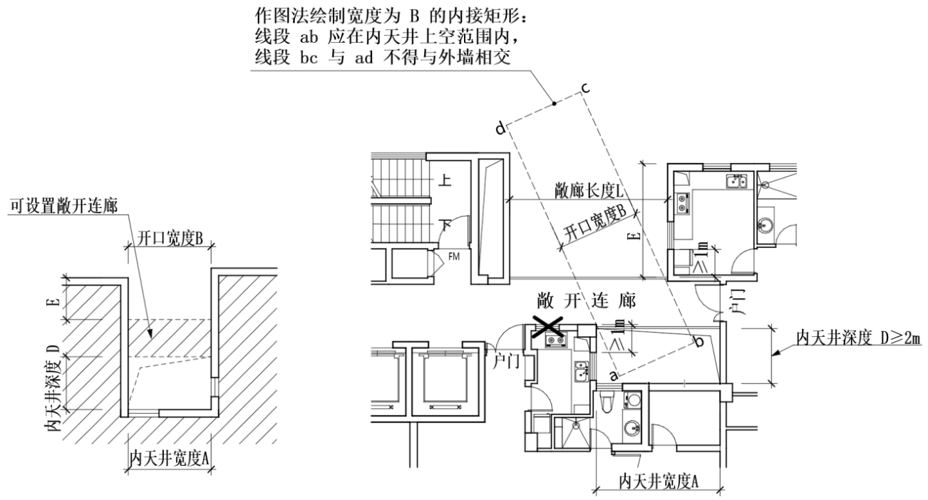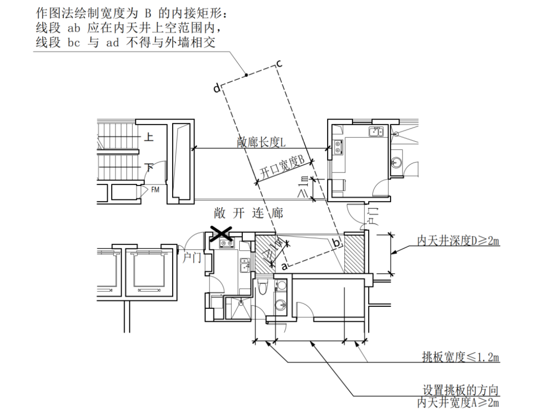 当A、B未对应设置时,可采用作图法控制开口宽度:绘制宽度为 B 的内接矩形,线段 ab 应在U型天井上空范围内,线段 bc 与 ad 不应与外墙相交;(附图2.3.17-1)