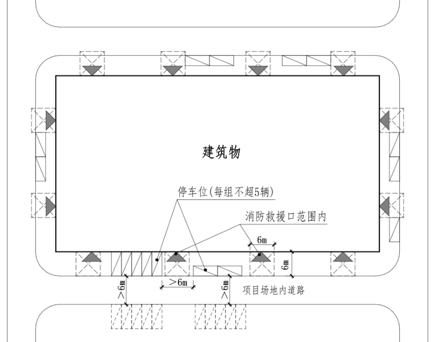 2 停车位的布置不应影响消防救援,每个消防救援口对应的6m范围内不得布置停车位;