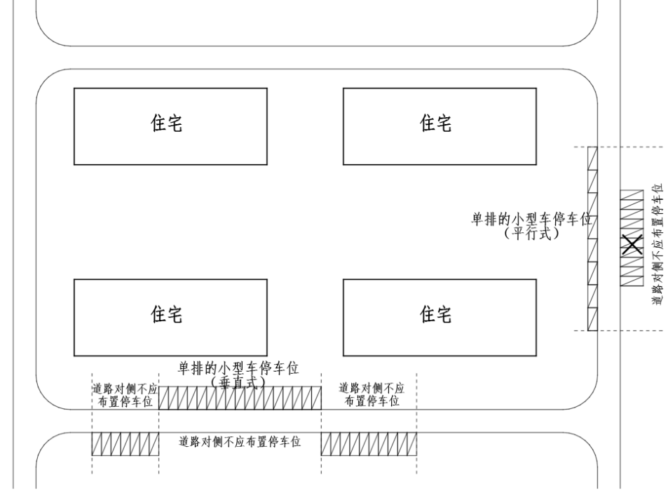 2.3.8 住宅小区地面配套的小型机动车停车位除可按本《指南》第2.3.7条布置外,还可采用沿小区道路单排布置的方式,单排停车数量可不限,可不按地面停车场认定,但其道路正对面不应再布置其他机动车停车位。(附