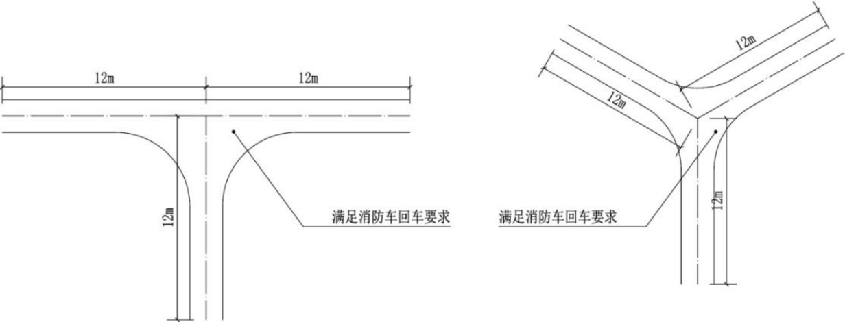 2.1.4 丁字形,Y字型等满足消防车回车要求的不规则场地可作为消防回车场地;丁字形,Y字型场地从交叉点起算的车道长度不应小于12m。(附图2.1.4)