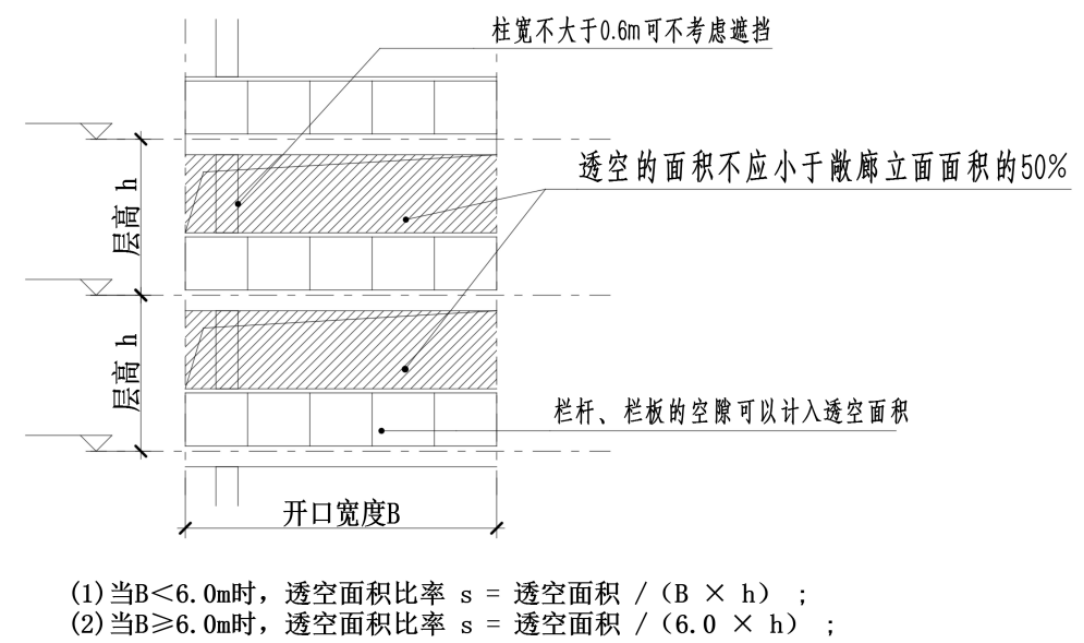 6 敞廊的立面透空面积比率不应小于50%,计算方法见附图2.3.17-6;当柱宽不大于0.6m可不考虑遮挡,但应考虑设置在敞廊处的空调室外机对敞开率的影响;