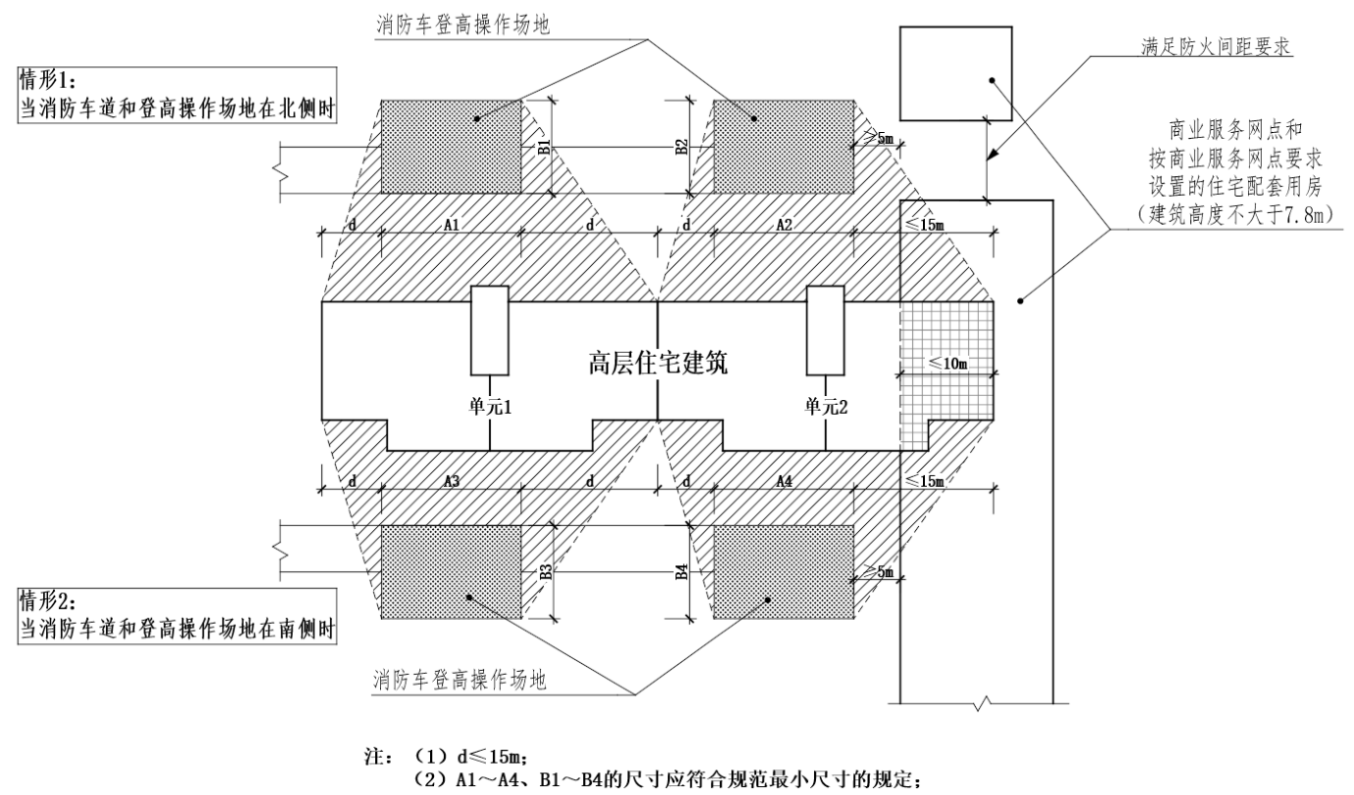 〔说明〕修订条文,明确高层建筑(包括工业建筑和民用建筑)的登高操作场地和消防登高操作面的要求。本条第4款的情况下住宅单元的数量不宜过多、建筑长度不宜超过150m,避免因不设穿过的车道而影响消防救援到达、展开救援。