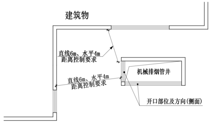 2 机械排烟开口不宜面向建筑,当确有困难,排烟开口面向建筑物时,其与上部建筑开口之间的直线距离不应小于6m,且水平距离不应小于4m;