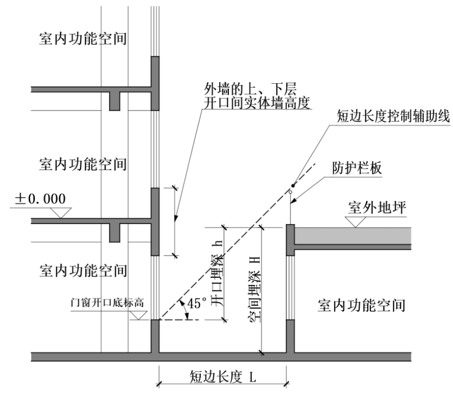 2 该空间四周外墙上门、窗开口(设置防火卷帘或防火门、窗的除外)的最低底边的埋深高度h和下沉空间短边长度L的尺寸控制,应符合下列规定: