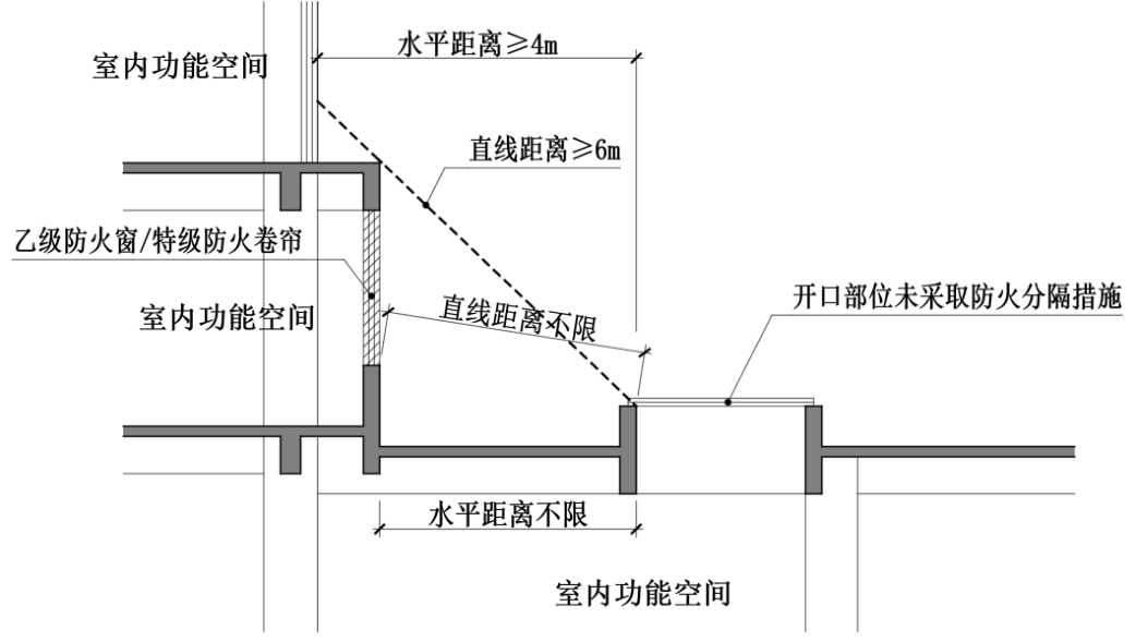 开口与上部建筑开口的水平距离可不限。当防火分隔措施不符合本款规定
