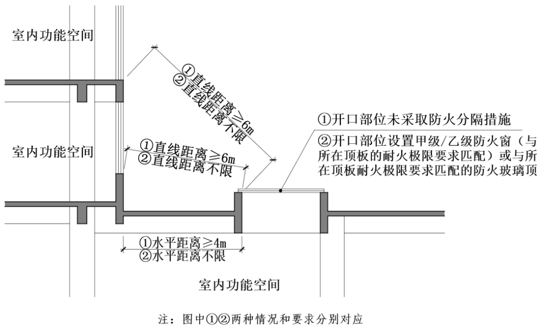 1 当为自然排烟口以及未采取防火分隔措施的采光、自然通风开口时,该开口与上部建筑开口之间的直线距离不应小于6m,且水平距离不应小于4m;当采光、自然通风开口部位设置固定防火玻璃顶或火灾时自动关闭的甲级或乙级防火窗(与所在顶板的耐火极限要求匹配)或与所在顶板耐火极限要求匹配的防火玻璃顶时,该开口与上部建筑开口之间的距离不限;(附图2.3.2-1)