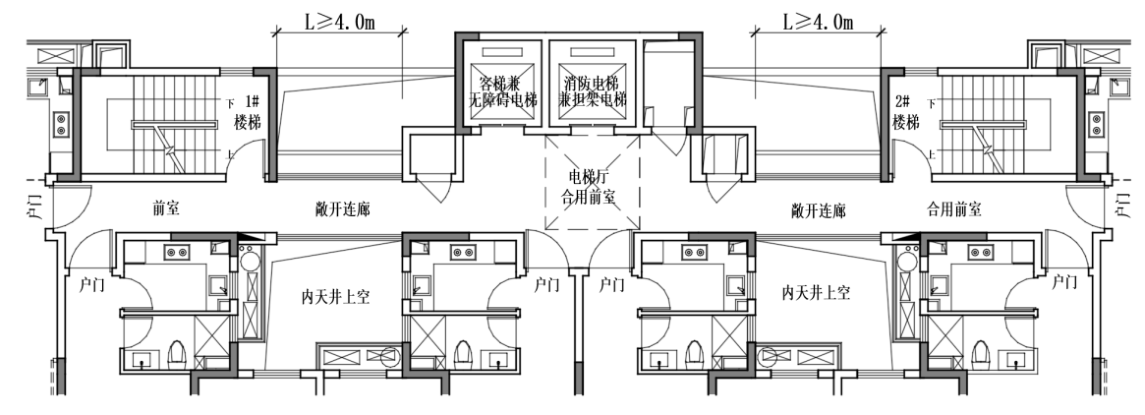 4 当住宅建筑的2个安全出口(疏散楼梯)分散设置距离不小于5m且敞廊长度L不小于4m时,之间连通的敞廊上可不设防火门,可不按照三合一前室考虑;(附图2.3.17-4)