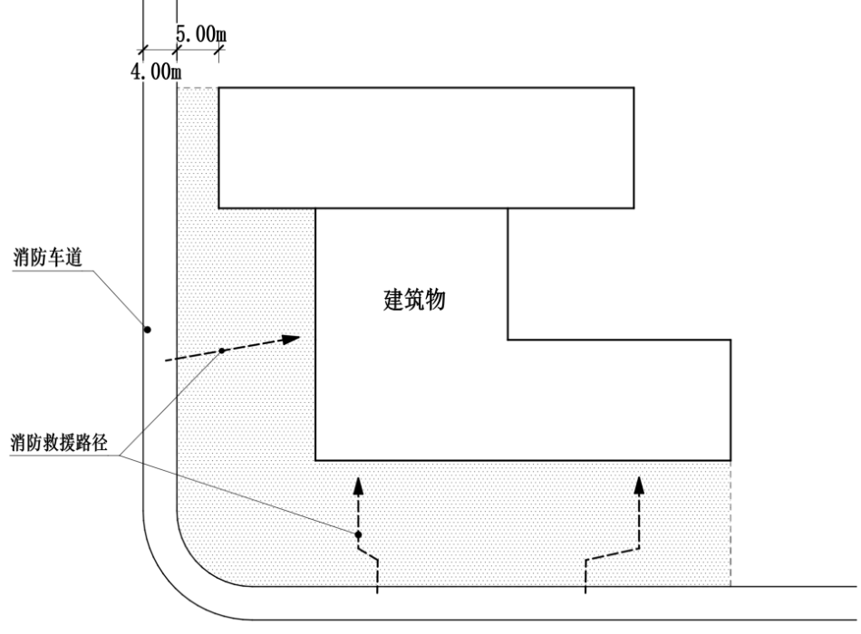 贴邻建筑的5m范围内不应布置架空线路和影响消防车操作的障碍物。 消防救援路径上不应设置影响救援的绿化、水面、挡墙等障碍物,救援路径总长度应符合本条对距离的要求。(附图2.1.1)