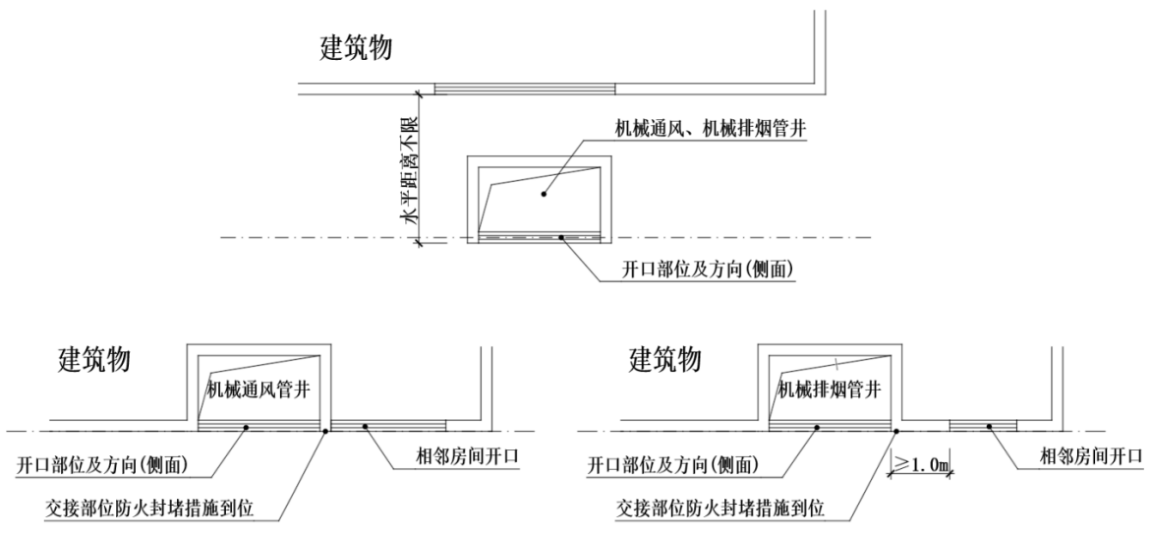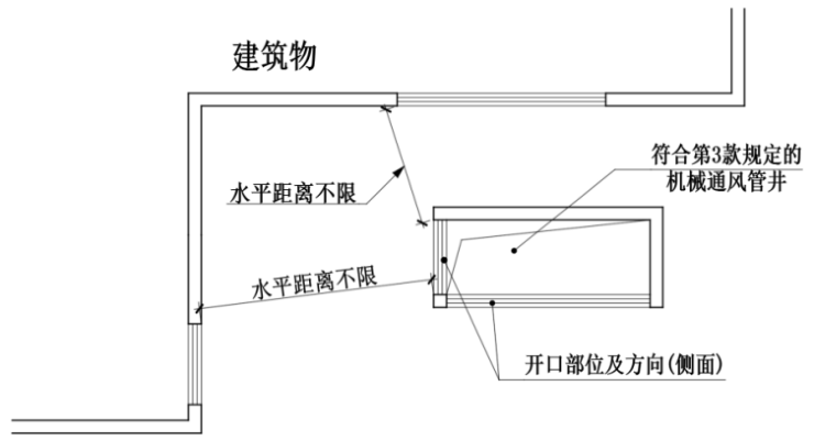 1 当机械通风、机械排烟开口背向建筑物时,其与上部建筑的距离可不限;此时,通风开口与同方向立面两侧相邻房间开口的水平距离也可不限,排烟开口与同方向立面两侧相邻房间开口的水平距离不应小于1m;开口在外墙交接部位均应采取防火封堵措施;(附图2.3.3-1)