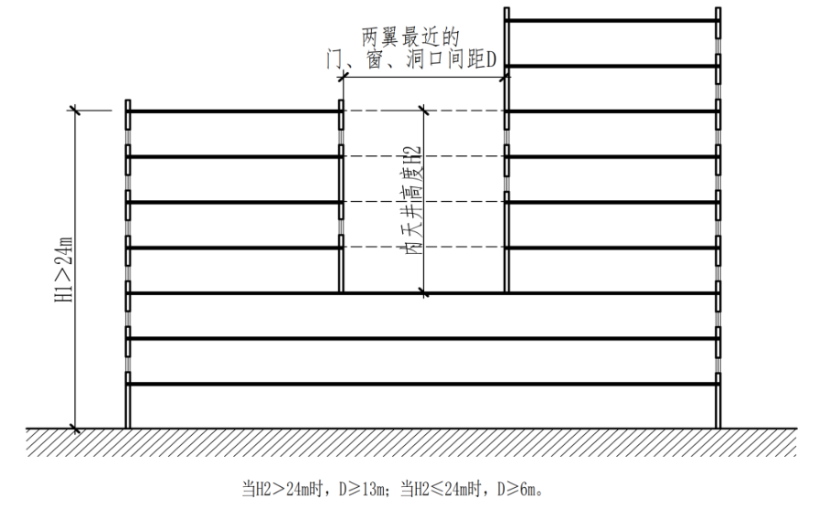2.3.16 当建筑高度大于24m时,回字形公共建筑相对的两翼属于同一防火分区时,相对的两翼最近的门、窗、洞口间距应不小于按照内天井的空间高度确定的相应防火间距要求。(附图2.3.16)