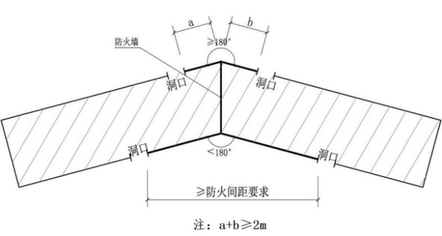 2.3.1 相邻两座建筑之间通过设置防火墙以满足防火间距不限的条件时,当两座相邻建筑形成夹角小于180度时,最近的门窗洞口间距不应小于相应的防火间距要求;当两座相邻建筑形成夹角不小于180度时,紧靠防火墙两侧的门、窗、洞口之间最近边缘的水平距离应不小于2m。(附图2.3.1)