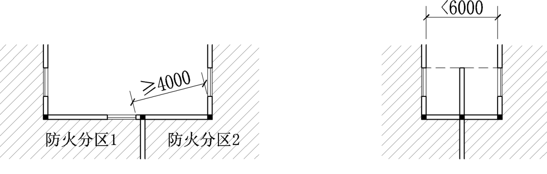 3 当该空间四周设置房间,且属于不同防火分区时,其内转角两侧外墙上的普通门、窗、洞口之间最近边缘的水平距离不应小于4m,相对两翼外墙上的普通门、窗、洞口之间的距离还应符合按空间埋深H确定的建筑高度相应的防火间距要求。