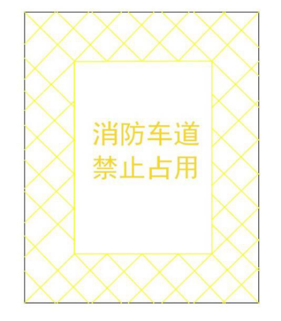 4 场地内的消防车道出入口路面,按照消防车道净宽施划禁停标线,标线为黄色网状实线,外边框线宽20cm,内部网格线宽10cm,内部网格线与外边框夹角45°,标线中央位置沿行车方向标注内容为“消防车道 禁止占用”的警示字样。禁停标线长宽不小于2.0m×1.5m(若受条件限制,无法满足醒目度要求,应按4∶3比例加大标志的尺寸)。