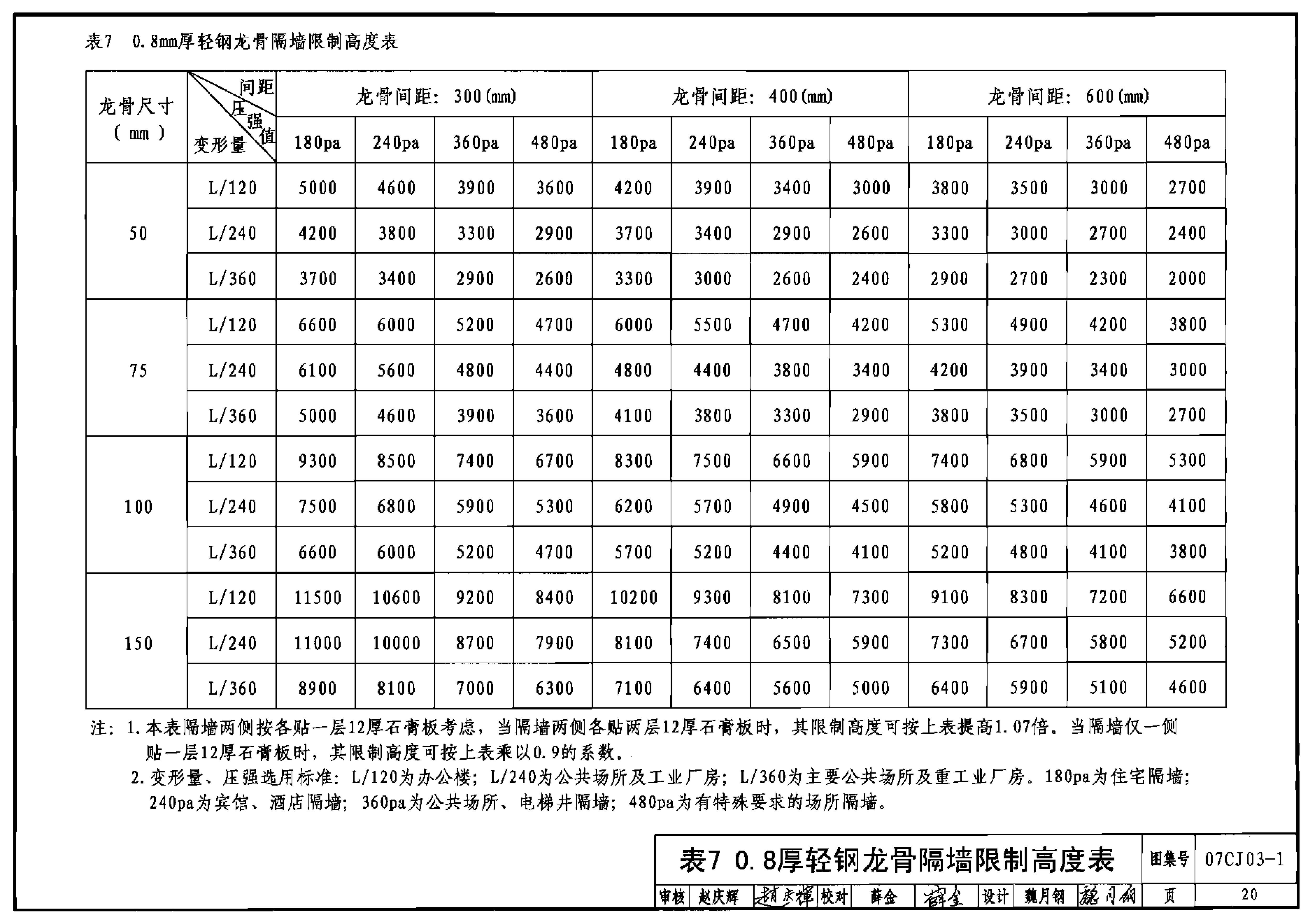表7 0.8厚轻钢龙骨隔墙限制高度表