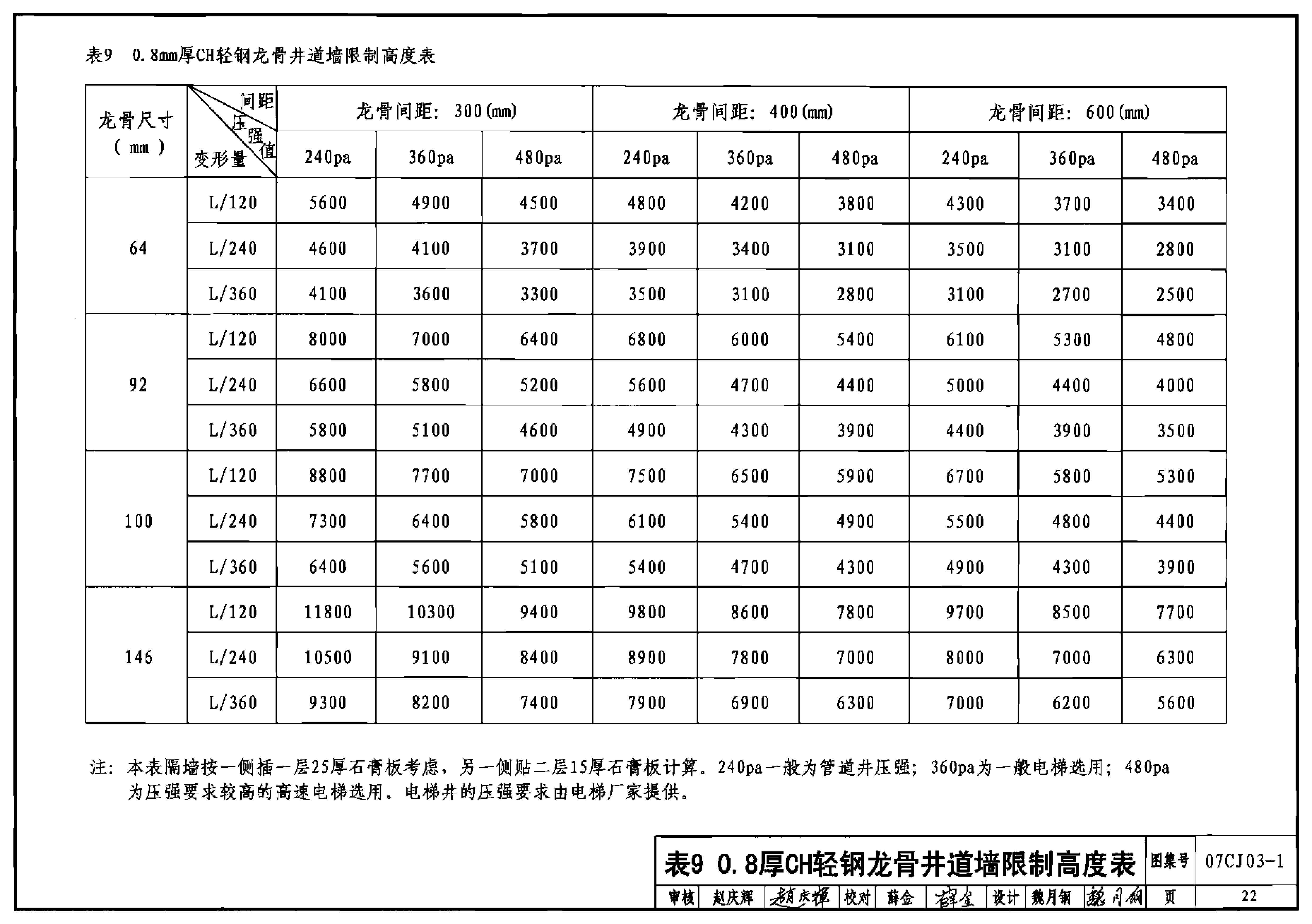 表9 0.8厚CH轻钢龙骨井道墙限制高度表