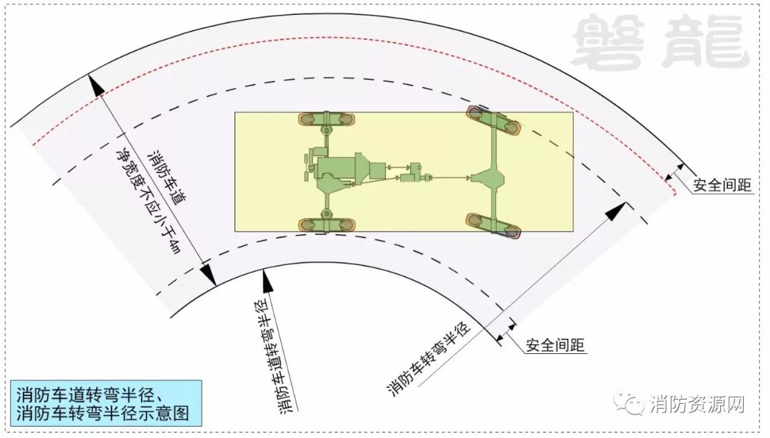 《消防资源网》石老师专题 :“ 消防车道转弯半径·消防车转弯半径-规范争议,解决方案!”:在“搜建筑”的文章中,提出“道路内缘半径=机动车转弯半径-车宽-安全距离”的概念,同时提出参考值“消防车宽2.5m,安全距离0.5m,合计为3.0m,道路半径=机动车转弯半径-3m“,是有一定道理的!