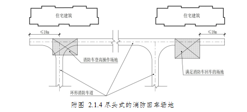 《浙江》2.1.4:住宅建筑尽端式消防车道、消防登高操作场地与环形消防车道距离大于18米时,应设置消防回车场地。