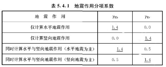 在众值烈度下的地震作用,应视为可变作用而不是偶然作用。这样,根据《统一标准》中确定直接作用(荷载)分项系数的方法,通过综合比较,本标准89版修订时,对水平地震作用,确定γEh=1.3,至于竖向地震作用分项系数,则参照水平地震作用,也取γEv=1.3。当竖向与水平地震作用同时考虑时,根据加速度峰值记录和反应谱的分析,二者的组合比为1:0.4,故γEh=1.3,γEv=0.4×1.3≈0.5。